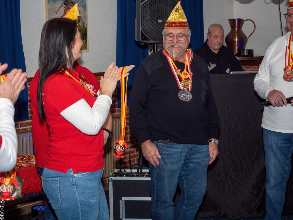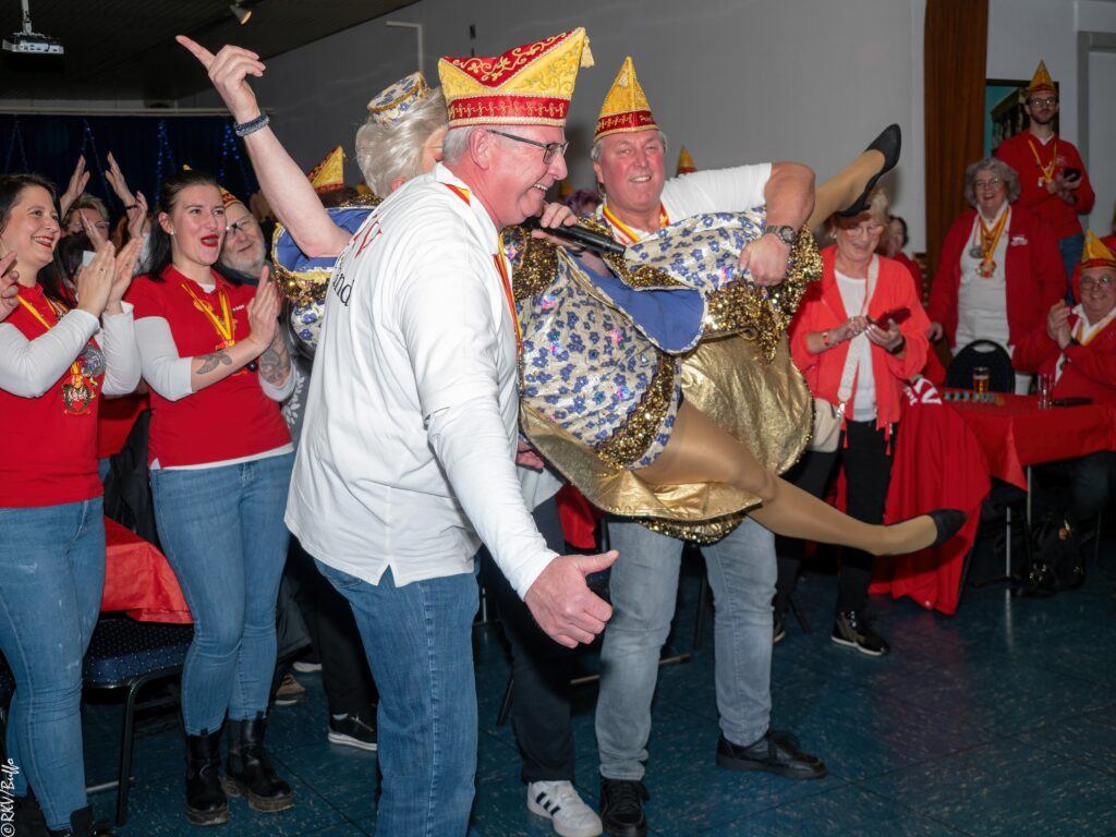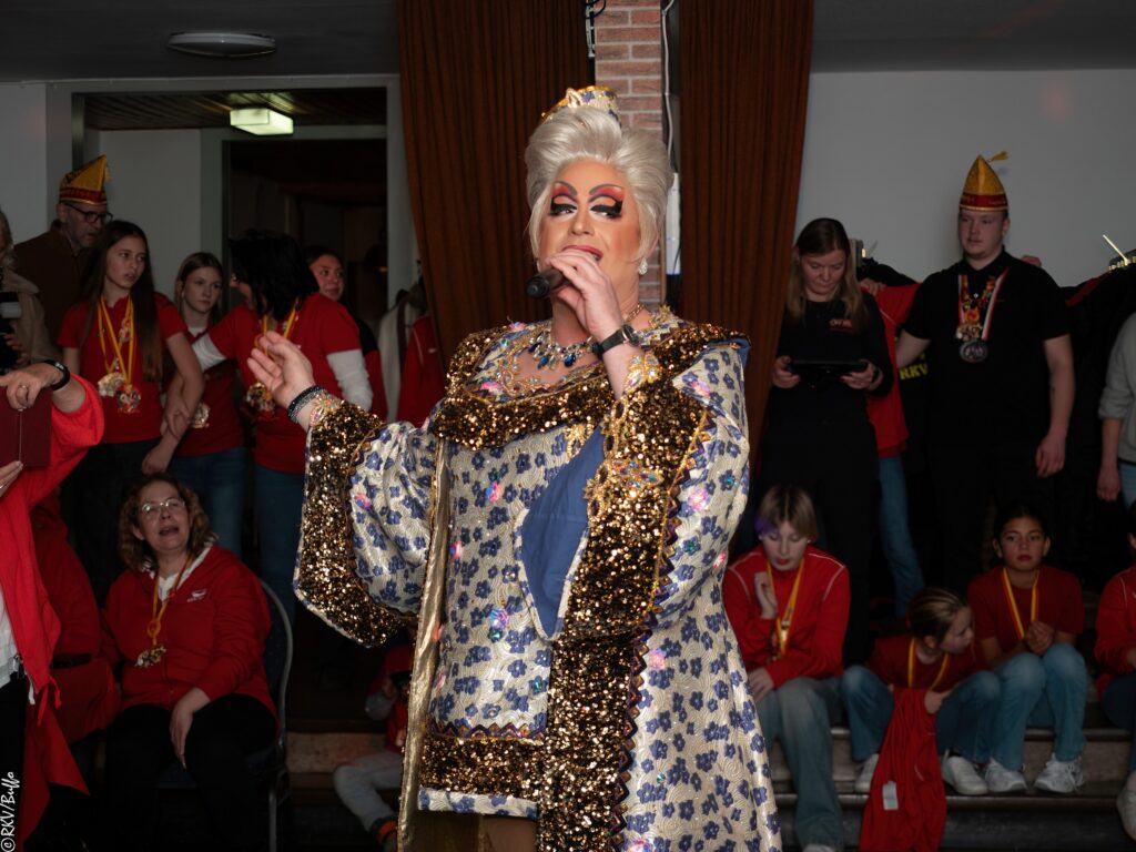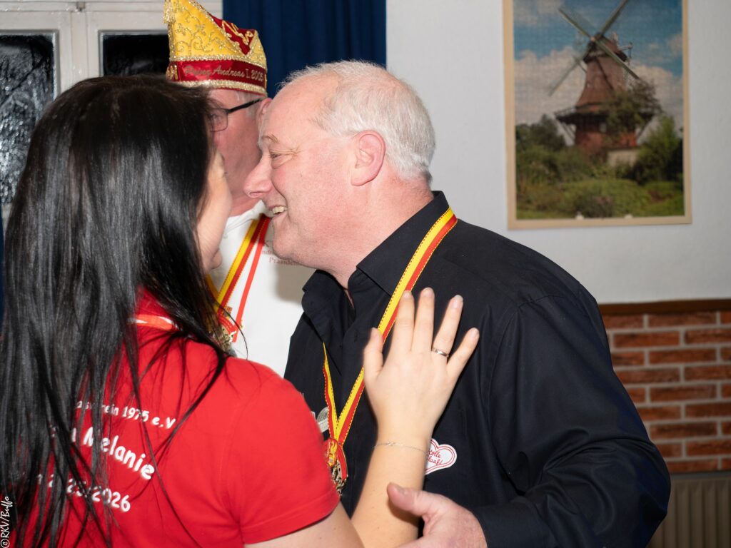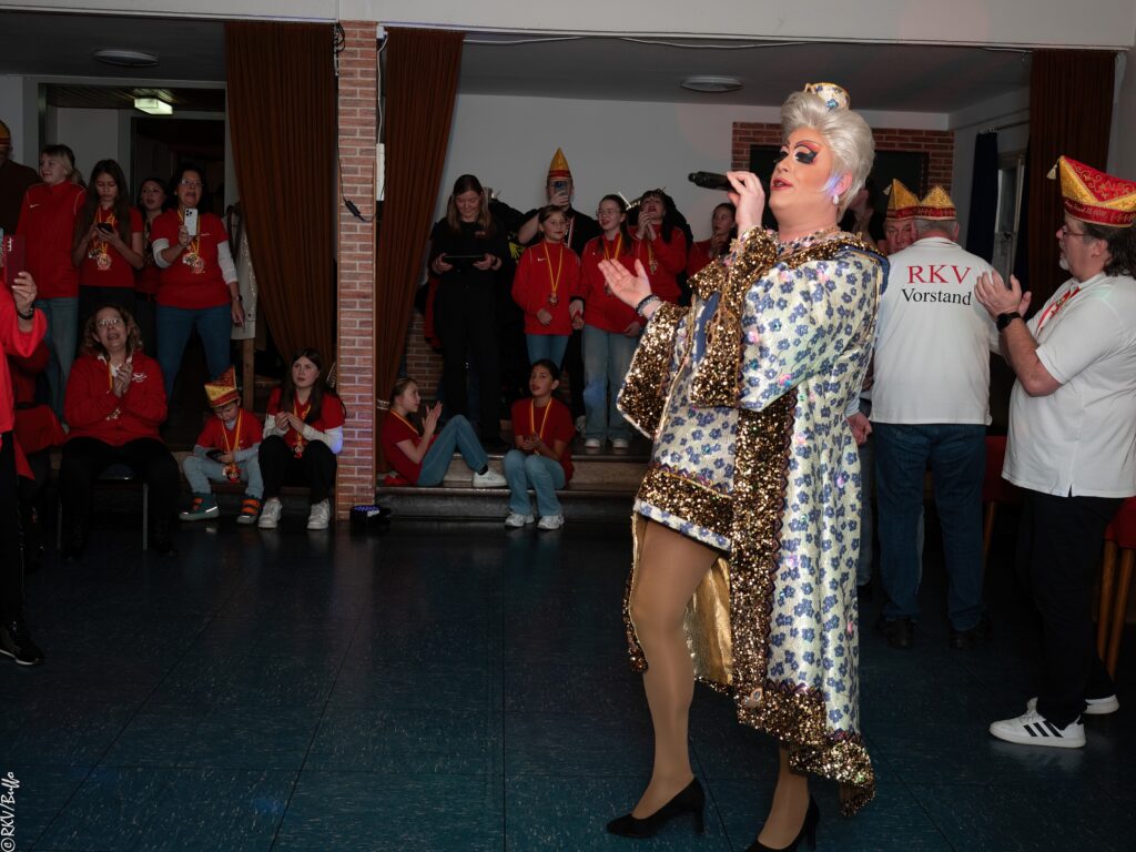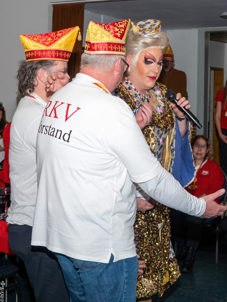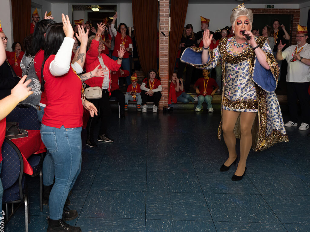 Ein besonderes Highlight war dann der Überraschungsauftritt von Ken Reise alias Julie Voyage. Julie Voyage präsentierte weihnachtliche Songs wie „In der Helmlackiererei“, lud mit kölschen Klassikern zum gemeinsamen Schunkeln ein und sorgte mit frechen Sprüchen und Pointen für Heiterkeit im Saal. Richtig laut wurde es dann, als Julie Voyage den Song „Komm mit mir nach Ründeroth“ sang. Mit dem neu aufgelegten Klassiker ist Julie Voyage sogar auf dem aktuellen „Karneval der Stars“-Sampler vertreten und damit Ründeroth’s berühmteste Botschafterin. Als langjähriges RKV-Mitglied wurde Ken Reise natürlich ebenfalls der aktuelle Sessionsorden vom Prinzenpaar verliehen.