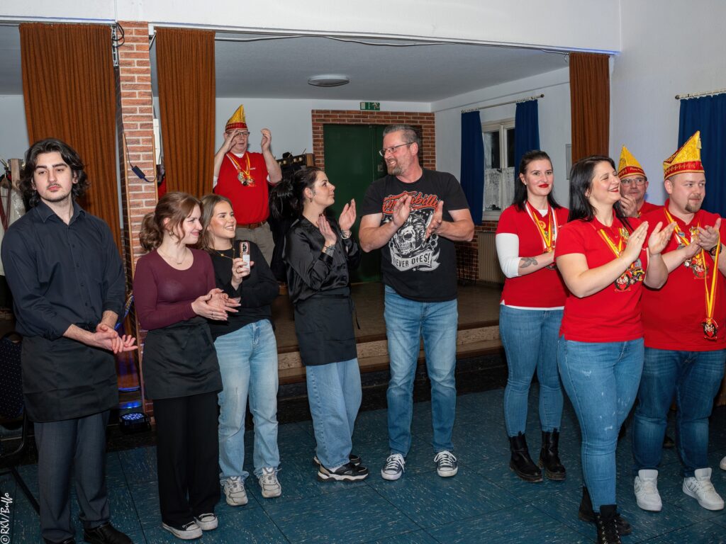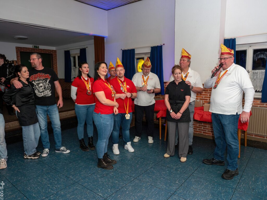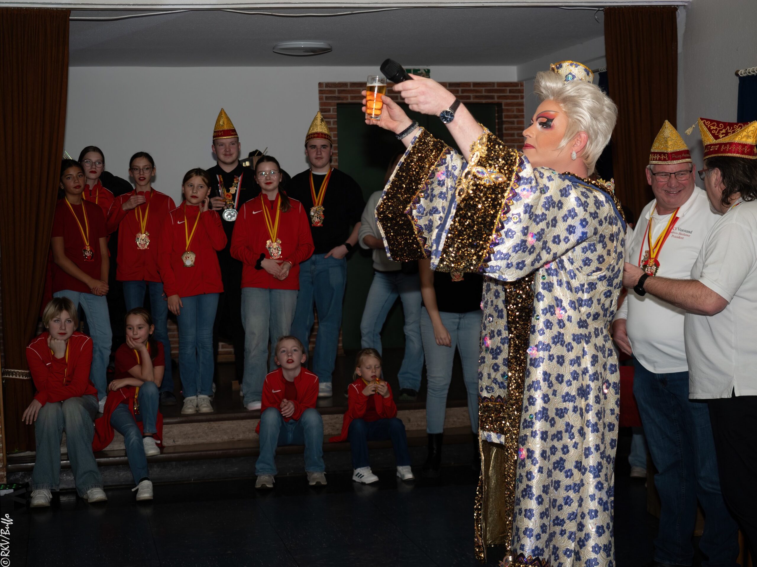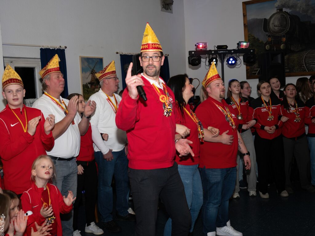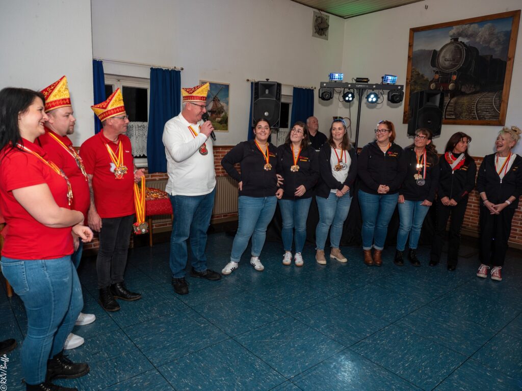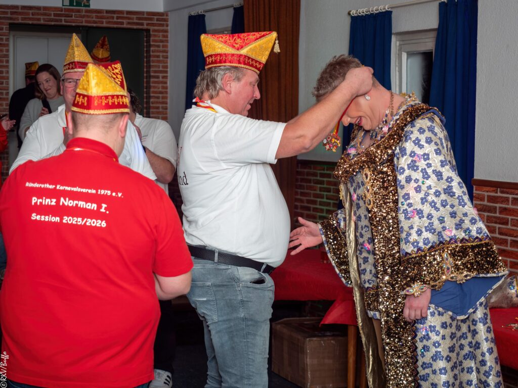 Ein besonderes Highlight war dann der Überraschungsauftritt von Ken Reise alias Julie Voyage. Julie Voyage präsentierte weihnachtliche Songs wie „In der Helmlackiererei“, lud mit kölschen Klassikern zum gemeinsamen Schunkeln ein und sorgte mit frechen Sprüchen und Pointen für Heiterkeit im Saal. Richtig laut wurde es dann, als Julie Voyage den Song „Komm mit mir nach Ründeroth“ sang. Mit dem neu aufgelegten Klassiker ist Julie Voyage sogar auf dem aktuellen „Karneval der Stars“-Sampler vertreten und damit Ründeroth’s berühmteste Botschafterin. Als langjähriges RKV-Mitglied wurde Ken Reise natürlich ebenfalls der aktuelle Sessionsorden vom Prinzenpaar verliehen.